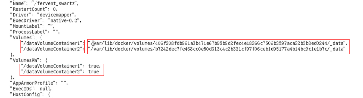 使用命令docker inspect CONTAINER_ID查看宿主机中的数据卷共享文件夹