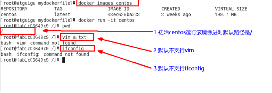 从docker hub 拉取下来的centos镜像启动后会默认进入根目录,但是不支持文本编辑器和查看IP