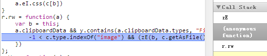 Chrome 调试工具的 Call Stack 就会告诉你,程序的上一步在哪里看一看 a 对象的属性基本可以断定它是一个 Event 对象,而且这里的这段 function 就是对粘贴事件的处理,为了验证,搜索一下 .rw 就会看到这样一段