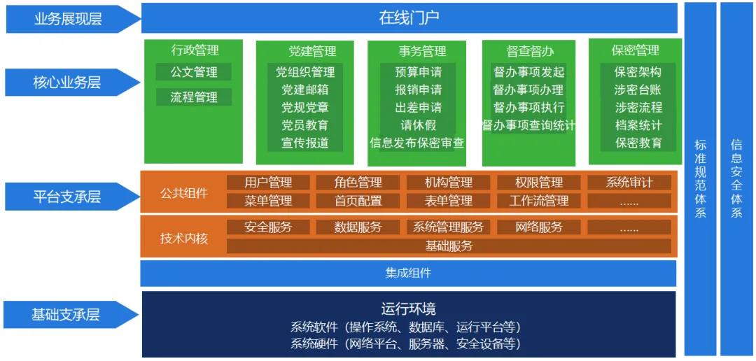 信创办公综合管理平台主要依托国产化软件作为技术支撑,根据企事业单位的业务特点,构建以台账、流程、公文、档案等为业务核心的基础框架,再根据不同的业务衍生具体的产品,帮助用户建立标准的管理过程,解决日常管理中的各项问题。
