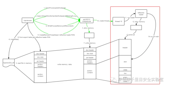 反射式 dll 注入与常规 dll 注入类似,而不同的地方在于反射式 dll 注入技术自己实现了一个 reflective loader() 函数来代替 LoadLibaryA() 函数去加载 dll,示意图如下图所示。蓝色的线表示与用常规dll注入相同的步骤,红框中的是 reflective loader() 函数行为,也是下面重点描述的地方。
