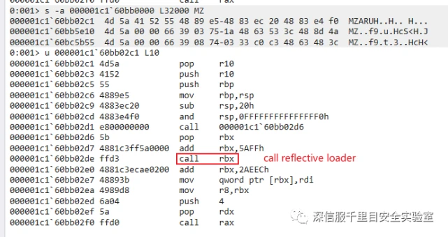 直接去搜 MZ 字串定位到 meterpreter loader 汇编的地址,进而定位到 reflective loader 的函数地址