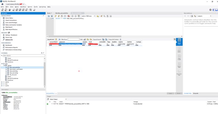 如果忘记用户名,可以打开MySQL WorkBench,右键kbe-Tables-kbeaccountinfos,点击select rows查看