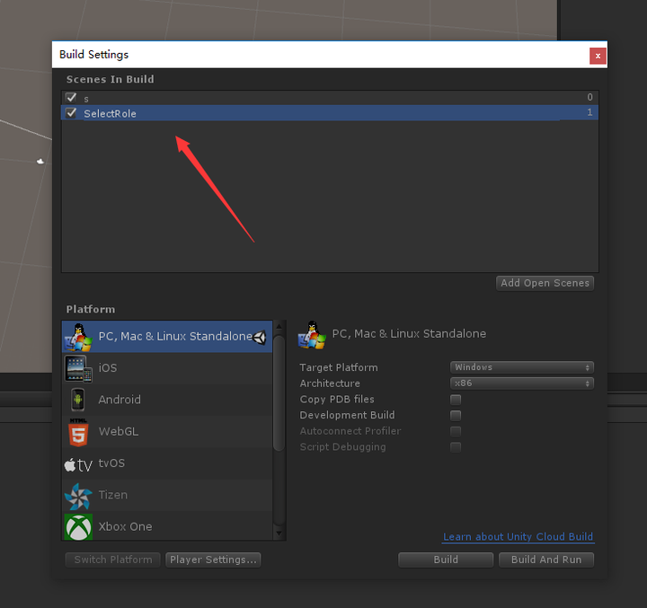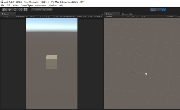 (4)创建一个名为SelectRole的场景,在场景中间放一个cube