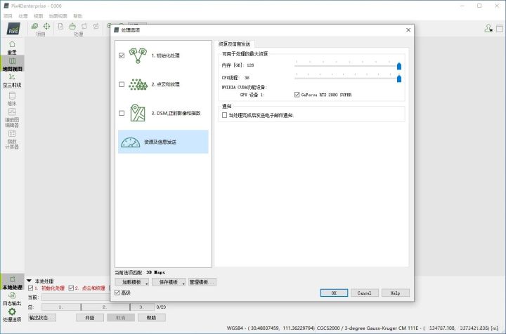 7.处理数据前打开设置把自己电脑的显卡勾选上启动显卡加速,一般数据没问题可以直接勾选1、2、3步直接完成,如果不确定数据是否正确或者有像控点一般只勾选第一步初始化处理然后点击确定点击开始处理就行