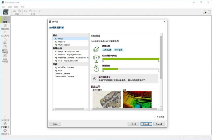 5.这里因为是需要正射影像图所以选择第一个标准3D Maps 输出质量高然后点击Finish就完成创建项目