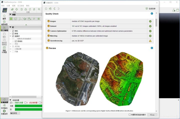 9.处理完成后第一步会变成绿色,日志输出里并没有任何报错表示第一步处理完成,打开质量报告可看具体详情