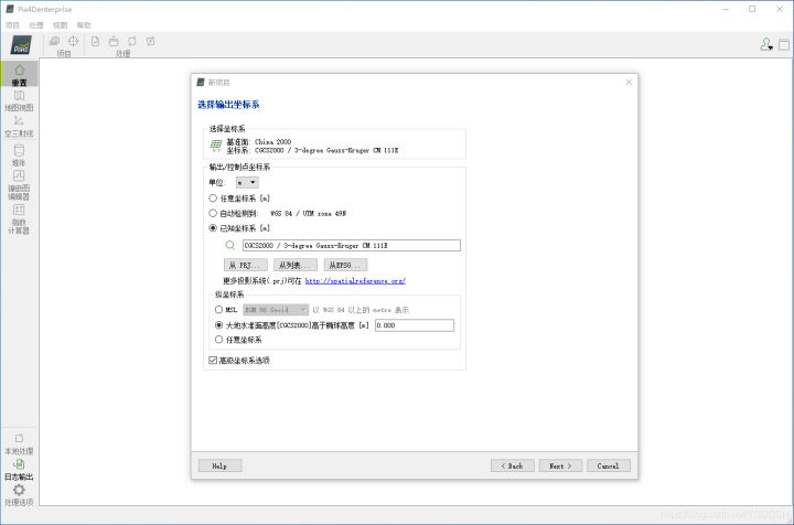 4.输出坐标系选择自己需要的坐标系,和像控点一致的坐标系或RTK默认的CGCS2000坐标系,然后点击下一步