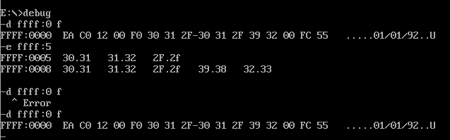 (2)使用e命令修改生产日期所在的内存单元,修改后,再次使用d命令查看,发现生产日期没有变化;