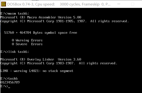 (2)使用masm、link对程序task6依次汇编、链接以及运行: