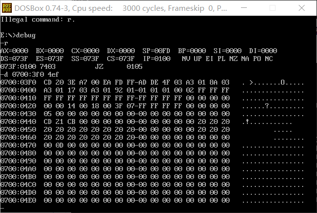 (2)在debug中,使用f命令批量填充内存单元b8f00H~b8f9fH,