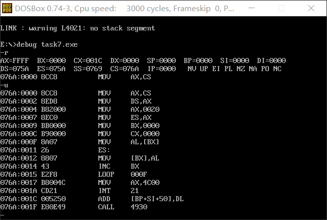 assume cs:code code segment mov ax,cs mov ds,ax mov ax,0020h mov es,ax mov bx,0 mov cx,17h s:mov al,[bx] mov es:[bx],al inc bx loop s mov ax,4c00h int 21h code ends end