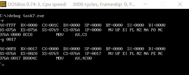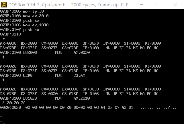 (1)使用t命令单步执行 mov ss, ax 时,不是单步执行完这一条指令就暂停了,后面的指令 mov sp, 30也紧跟着执行了,由下图的逻辑地址空间的变化可以看出指令的执行: