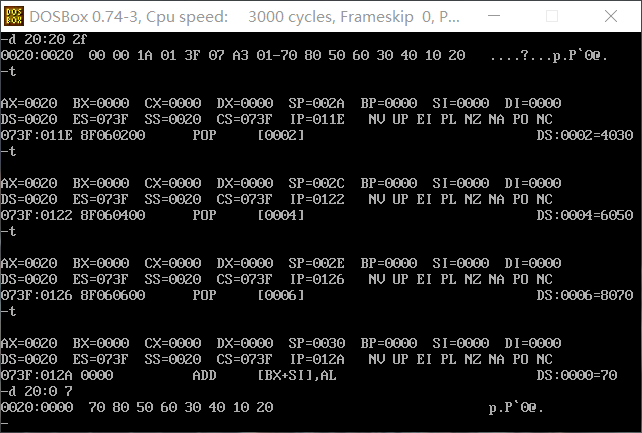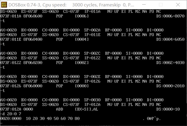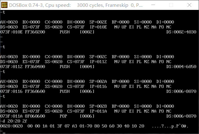 (4)如果把最后四条指令改成截图中的顺序, pop [6] 指令执行结束后,使用d命令 d 20:0 7 查看此时 数据空间内的数据发现数据空间中的数据发生了变化: