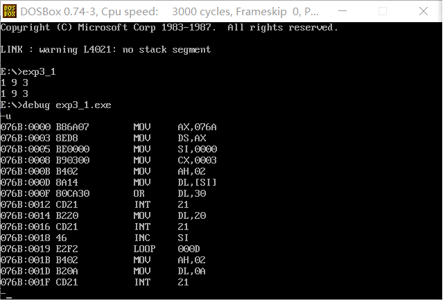 1 assume cs:code, ds:data 2 3 data segment 4 x db 1, 9, 3 5 len1 equ $ - x 6 7 y dw 1, 9, 3 8 len2 equ $ - y 9 data ends 10 11 code segment 12 start: 13 mov ax, data 14 mov ds, ax 15 16 mov si, offset x 17 mov cx, len1 18 mov ah, 2 19 s1:mov dl, [si] 20 or dl, 30h 21 int 21h 22 23 mov dl, ' ' 24 int 21h 25 26 inc si 27 loop s1 28 29 mov ah, 2 30 mov dl, 0ah 31 int 21h 32 33 mov si, offset y 34 mov cx, len2/2 35 mov ah, 2 36 s2:mov dx, [si] 37 or dl, 30h 38 int 21h 39 40 mov dl, ' ' 41 int 21h 42 43 add si, 2 44 loop s2 45 46 mov ah, 4ch 47 int 21h 48 code ends 49 end start