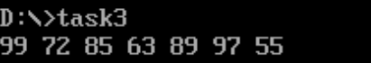 1 assume cs:code, ds:data 2 data segment 3 x db 99, 72, 85, 63, 89, 97, 55 4 len equ $ - x 5 data ends 6 code segment 7 start: 8 mov ax,data 9 mov ds,ax 10 mov byte ptr ds:[len],10 11 mov cx,7 12 mov bx,0 13 s: mov al,ds:[bx] 14 mov ah,0 15 inc bx 16 call printNumber 17 call printSpace 18 loop s 19 mov ah,4ch 20 int 21h 21 printNumber: 22 div byte ptr ds:[len] 23 mov dx,ax 24 mov ah,2 25 or dl,30h 26 int 21h 27 mov ah,2 28 mov dl,dh 29 or dl,30h 30 int 21h 31 ret 32 printSpace: 33 mov dl,' ' 34 mov ah,2 35 int 21h 36 ret 37 code ends 38 end start