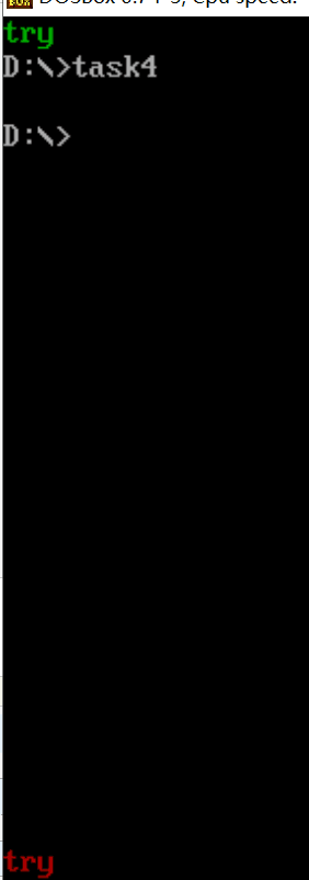 1 assume cs:code,ds:data,ss:stack 2 data segment 3 str db 'try' 4 len equ $ - str 5 data ends 6 7 stack segment 8 db 16 dup(0) 9 stack ends 10 11 code segment 12 start: 13 mov ax,data 14 mov ds,ax 15 16 mov ax,stack 17 mov ss,ax 18 mov sp,16 19 20 mov ax,0b800h 21 mov es,ax ;显存地址空间 22 23 mov si,offset str 24 mov cx,len 25 mov bl,2h ;黑底绿字 26 mov bh,0 27 call printStr 28 29 mov si,offset str 30 mov cx,len 31 mov bl,4h ;黑底红字 32 mov bh,24 33 call printStr 34 mov ah,4ch 35 int 21h 36 37 printStr: push bx 38 mov al,0a0h ;一行占160个字节 39 mul bh ;160*bh->ax 40 mov bx,ax ;把偏移地址存在bx里 41 pop ax 42 mov ah,al;高位存放属性信息 43 44 s: mov al,[si] ;低位存放字符 45 mov es:[bx+si],ax 46 inc bx 47 inc si 48 loop s 49 ret 50 51 code ends 52 end start