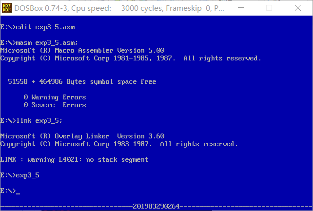 1 assume ds:data,cs:code 2 data segment 3 stu_no db '201983290264' 4 len = $ - stu_no 5 data ends 6 7 code segment 8 start: mov ax,data 9 mov ds,ax 10 11 mov ax,0b800h 12 mov es,ax 13 14 mov si,1 15 mov cx,7D0h 16 s: mov byte ptr es:[si],17h 17 add si,2 18 loop s 19 20 mov bx,0f00h 21 call prints 22 mov si,offset stu_no 23 mov cx,len 24 s2: call printnum 25 loop s2 26 call prints 27 mov ah,4ch 28 int 21h 29 30 prints: mov cx,34 31 s3: mov byte ptr es:[bx],'-' 32 add bx,2 33 loop s3 34 ret 35 36 printnum:mov al,[si] 37 or al,30h 38 mov byte ptr es:[bx],al 39 inc si 40 add bx,2 41 ret 42 code ends 43 end start