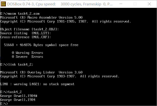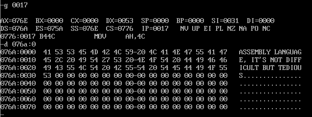 1 assume cs:code, ds:data 2 data segment 3 str db 80 dup(?) 4 data ends 5 6 code segment 7 start: 8 mov ax, data 9 mov ds, ax 10 mov si, 0 11 s1: 12 mov ah, 1 13 int 21h 14 mov [si], al 15 cmp al, '#' 16 je next 17 inc si 18 jmp s1 19 next: 20 mov ah, 2 21 mov dl, 0ah 22 int 21h 23 24 mov cx, si 25 mov si, 0 26 s2: mov ah, 2 27 mov dl, [si] 28 int 21h 29 inc si 30 loop s2 31 32 mov ah, 4ch 33 int 21h 34 code ends 35 end start