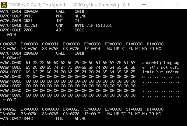 1 assume cs:code,ds:data 2 data segment 3 str db "assembly language, it's not difficult but tedious" 4 len = ($ - str) 5 data ends 6 stack segment 7 db 128 dup(0) 8 top equ $ + 1 9 stack ends 10 code segment 11 start: 12 mov ax,data 13 mov ds,ax 14 mov ax,stack 15 mov ss,ax 16 mov sp,top 17 18 mov si,0 19 mov cx,len 20 call strupr 21 mov ah,4ch 22 int 21h 23 strupr: 24 ;0100 0001 A 25 ;0110 0001 a 26 s: 27 cmp byte ptr ds:[si],61h 28 jb s1;无符号小于则跳转 29 cmp byte ptr ds:[si],7ah 30 ja s1;无符号大于则跳转 31 mov dl,ds:[si] 32 and dl,11011111B 33 mov ds:[si],dl 34 s1: 35 inc si 36 loop s 37 ret 38 code ends 39 end start