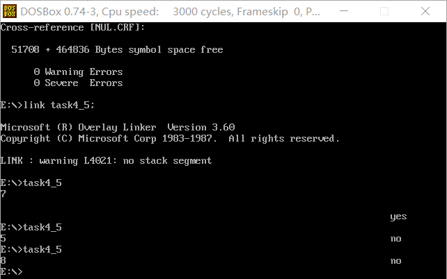 1 assume cs:code, ds:data 2 3 data segment 4 str1 db "yes", '$' 5 str2 db "no", '$' 6 data ends 7 8 code segment 9 start: 10 mov ax, data 11 mov ds, ax 12 13 mov ah, 1 14 int 21h 15 16 mov ah, 2 17 mov bh, 0 18 mov dh, 24 19 mov dl, 70 20 int 10h 21 22 cmp al, '7' 23 je s1 24 mov ah, 9 25 mov dx, offset str2 26 int 21h 27 28 jmp over 29 30 s1: mov ah, 9 31 mov dx, offset str1 32 int 21h 33 over: 34 mov ah, 4ch 35 int 21h 36 code ends 37 end start