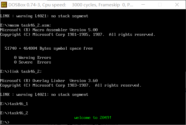 1 assume cs:code,ds:data 2 data segment 3 x dw 91,792,8536,65521,2021 4 len equ $-x 5 data ends 6 stack segment 7 db 64 dup(0) 8 top equ $+1 9 stack ends 10 code segment 11 start: 12 mov ax,data 13 mov ds,ax 14 mov ax,stack 15 mov ss,ax 16 mov sp,top 17 18 mov cx,len/2 19 mov bx,0 20 s1: 21 mov ax,ds:[bx] 22 push bx 23 push cx 24 call printNumber 25 call printSpace 26 pop cx 27 pop bx 28 add bx,2 29 loop s1 30 31 mov ah,4ch 32 int 21h 33 34 printNumber: 35 ;ax dx 36 ;ax 被除数,直到 37 ;cx计有多少位,然后循环出栈输出 38 mov bx,10 39 mov cx,0 40 s2: 41 mov dx,0 42 div bx 43 ;ax 商 44 ;dx 余数 45 push dx 46 inc cx 47 cmp ax,0 48 jne s2 49 50 s3: 51 mov ah,2 52 pop dx 53 or dl,30h 54 int 21h 55 loop s3 56 ret 57 58 printSpace: 59 mov ah,2 60 mov dl,20h 61 int 21h 62 ret 63 64 code ends 65 end start
