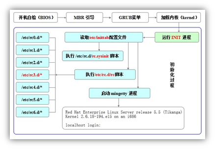 早起的linux系统服务的管理方式被称为 SysV ,特点是系统核心第一支呼叫的程序是 init , 然后 init 去唤起所有的系统所需要的服务,不论是本地服务还是网络服务。系统启动的基本流程如下图: