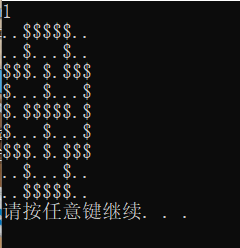 1 #include<iostream> 2 using namespace std; 3 4 int hoge(int x,int y,int n){ 5 if(x == 2 * (n+1) && y <= 2 * n) //第一排 6 return 1; 7 else if(x == 2 * n + 1 && y == 2 * n) //第二排 8 return 1; 9 else if(x < 2 * n && y == 2 * (n+1)) //四周边框 10 return 1; 11 else if(x == 0 && y == 0) //图形中心 12 return 1; 13 else if(x == 2 * n && (y == 2 * (n+1) || y == 2 * (n+1) - 1 || y == 2 * (n+1) - 2)) //第三排 14 return 1; 15 return 0; 16 } 17 18 int main(){ 19 int n; 20 cin >> n; 21 int x = 2 * (n+1); 22 for(int i = 0;i < 4 * n + 5;i++){ 23 for(int j = 0;j < 4 * n + 5 ;j++){ 24 int k; 25 for(k = 0;k <= n; k++) 26 if(hoge (abs (x-i),abs (x-j), k) ==1){ 27 cout<<"$"; 28 break; 29 } 30 if(k == n+1) 31 cout<<"."; 32 } 33 cout<<endl; 34 } 35 return 0; 36 }