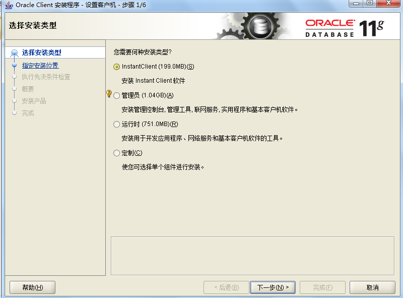 a、分支一:向图上这种直接点了安装instantclient(199MB)轻量级安装——安装最后会缺失三个重要组件:集成管理工具、配置和移植工具、应用程序开发,最终导致只有sqlplus可用,没法配置PL/sql Developer的监听,导致最终PL/sql Developer没法使用;