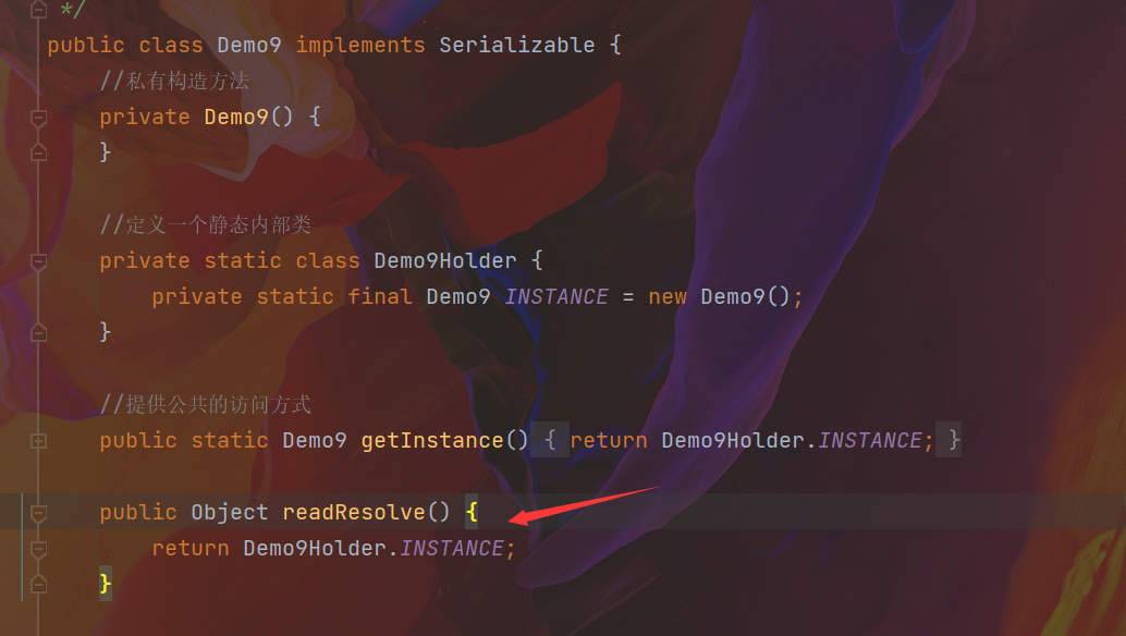 在类中添加readSolve方法,在序列化时被反射调用,如果定义了这个方法,就返回这个方法的返回值,反之没有定义该放大,就返回新new出来的对象