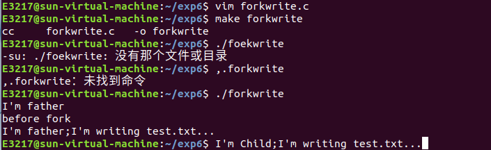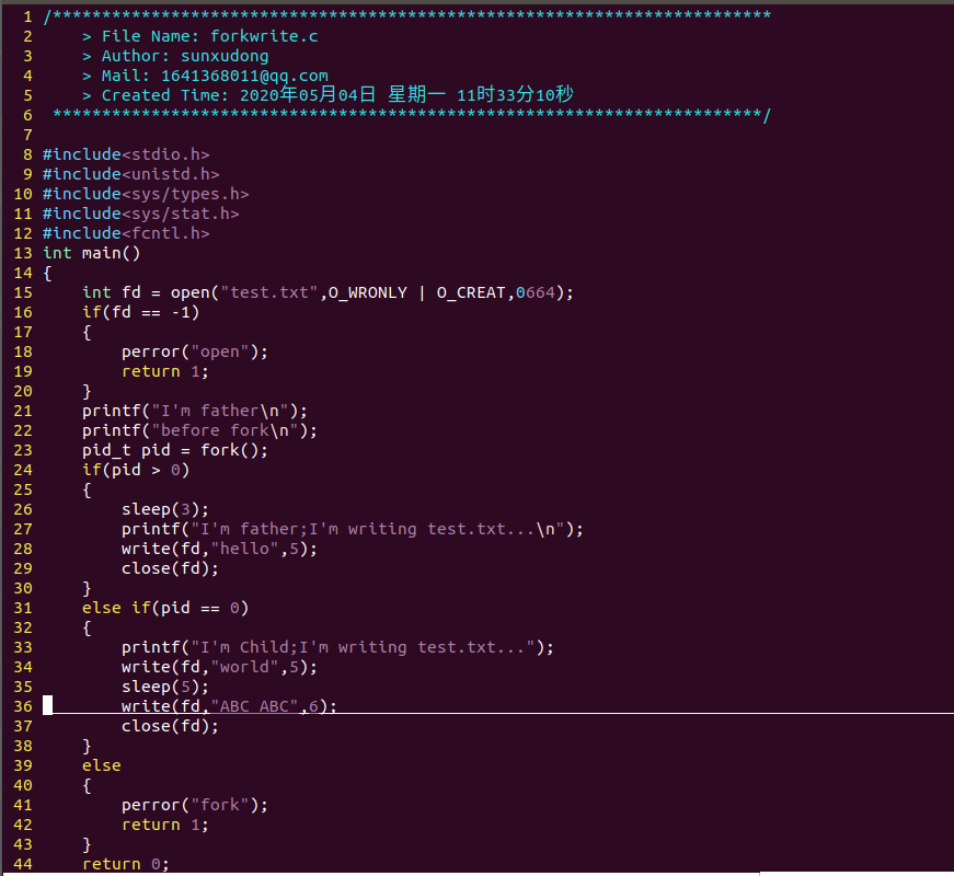 6.在 fork 之前以写的方式创建了一个文件 test.txt。然后 fork 出的子进程立即向文件中写入“world”,然后睡眠5秒。而父进程在 fork 后睡眠3秒后向 test.txt 写入 "hello",并关闭描述符。子进程恢复后,又向 test.txt 文件中写入 "ABC ABC"后关闭描述符,结束。