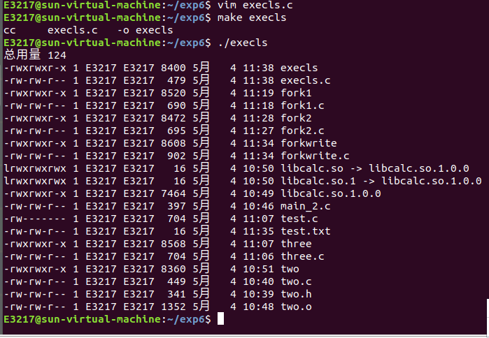 7.分别在主函数中使用 execvp 启动 ls 命令以及使用 fork 函数产生子进程调用 execvp 启动 ls 。