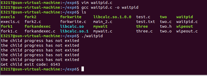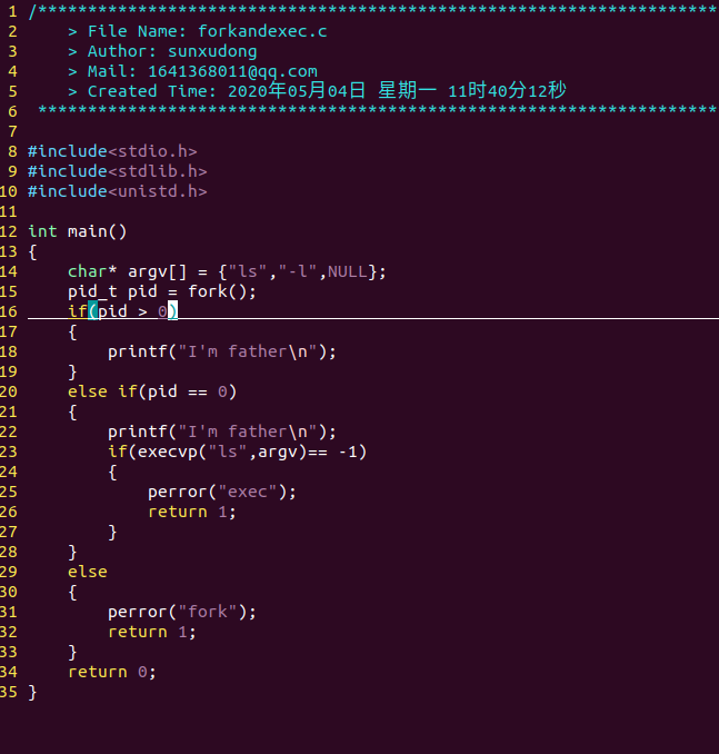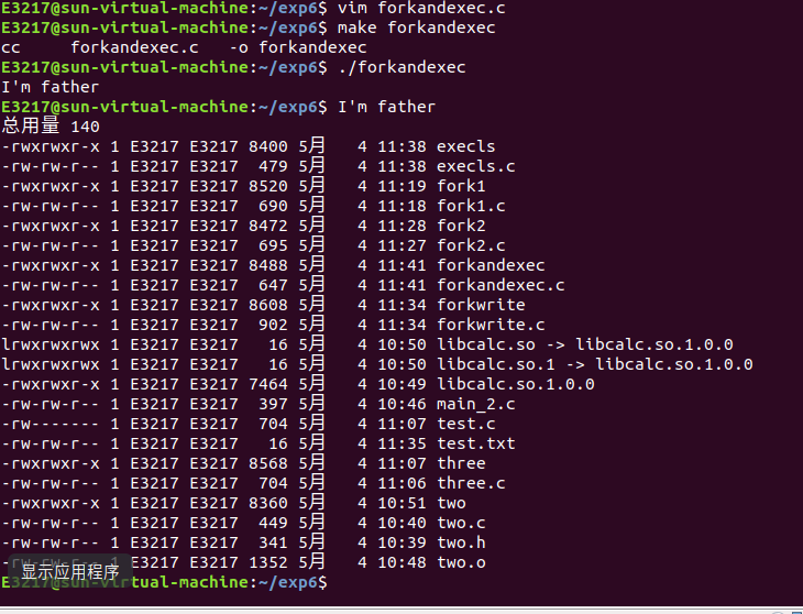 fork函数产生子进程调用excevp启动ls,创建forkandexec.c文件