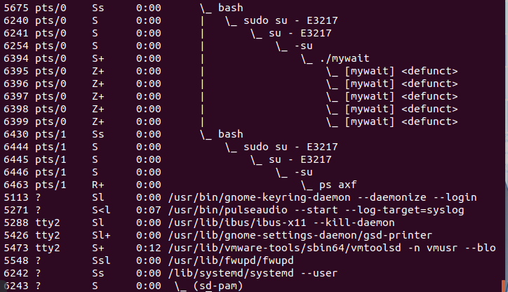 8.创建5个僵尸进程,并在终端通过 ps axf 命令查看僵尸进程信息。