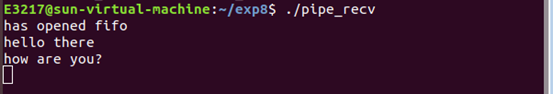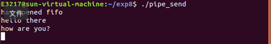 现在两个终端都处于阻塞状态,在运行pipe_send的终端输入数据,然后就可以在运行的pipe_recv的终端看到相应的输出: