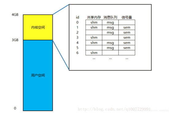 进程空间的高 1G 空间( 3GB-4GB )是内核空间,该空间中保存了所有的 IPC 内核对象。