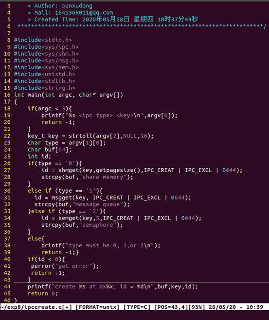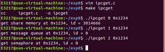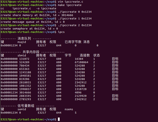 例题:程序 ipccreate 用于在指定的键值上创建 ipc 内核对象。使用格式为 ./ipccreate ,比如./ipccreate 0 0x8888 表示在键值 0x8888 上创建共享内存。