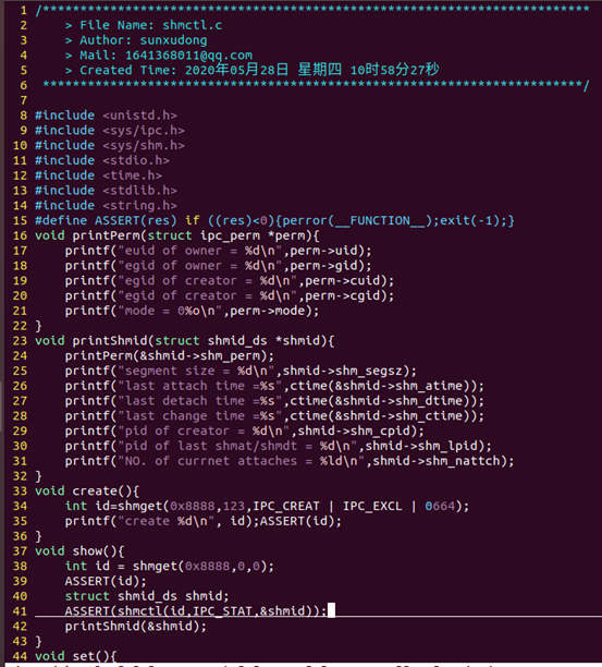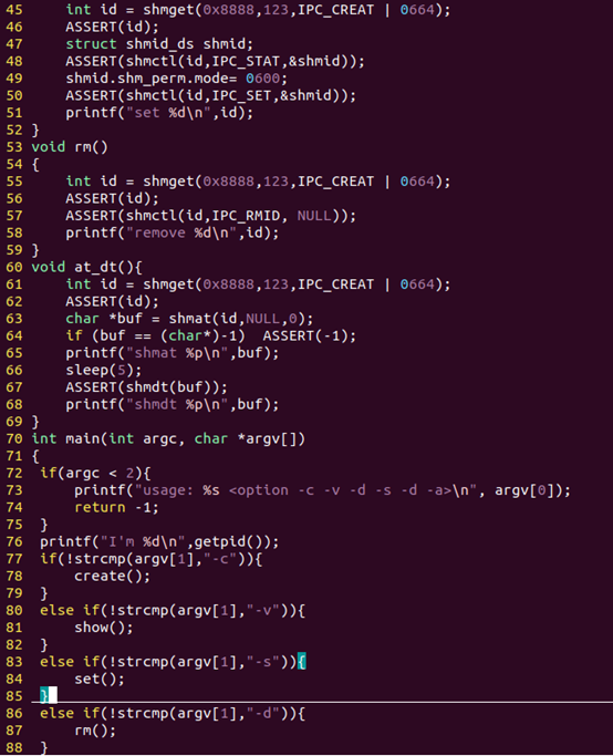 例题:编写一个程序 shmctl 可以用来创建、删除内核对象,也可以挂接、卸载共享内存,还可以打印、设置内核对象信息。具体使用方法具体见下面的说明: