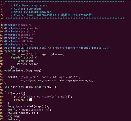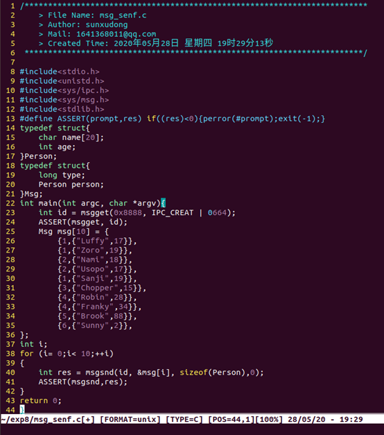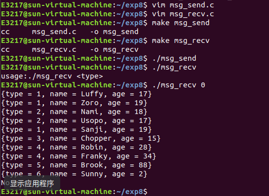 例题:程序 msg_send 和 msg_recv 分别用于向消息队列发送数据和接收数据。 msg_send 程序定义了一个结构体 Msg ,消息正文部分是结构体 Person 。该程序向消息队列发送了 10 条消息。