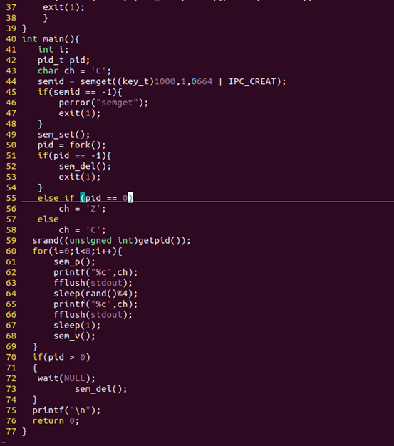 这里可以看到字符是成对出现的,如果修改程序把63行 sem_p(); 和70行 sem_v();