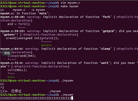 注释掉,在编译运行会发现字符可能就不会成对出现了,这里就是用信号量来帮我们实现进程间的同步的。