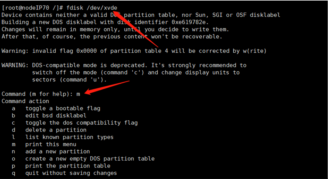 输入:fdisk /dev/xvde