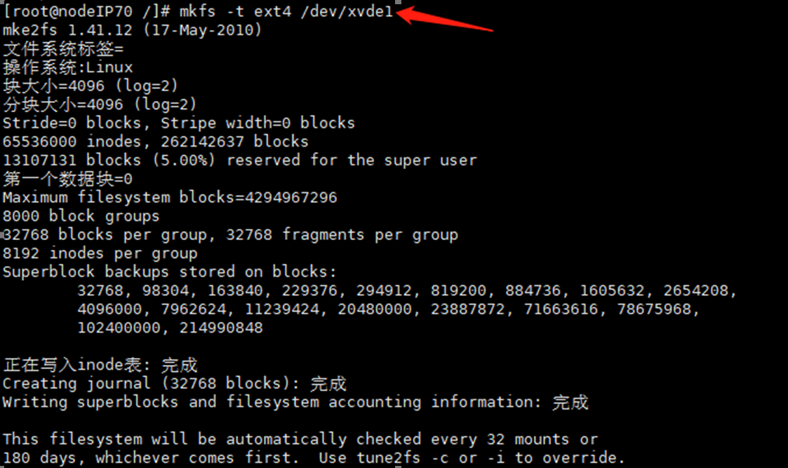 输入:mkfs -t ext4 /dev/xvde1