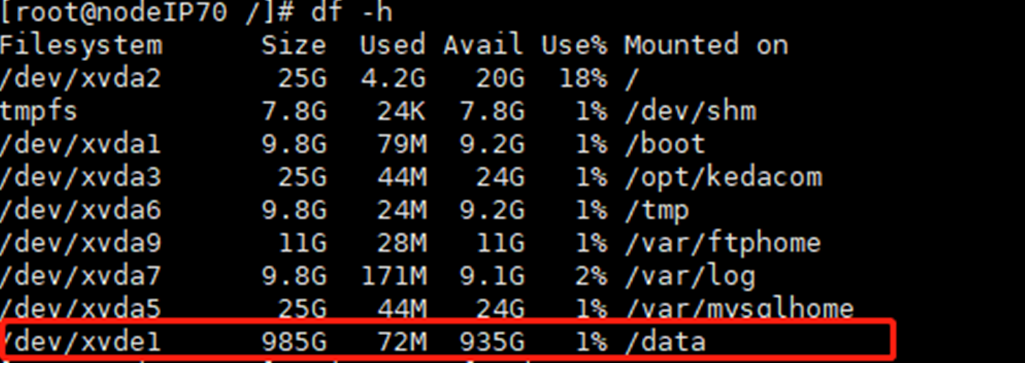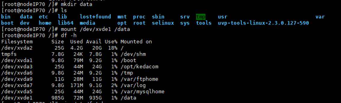 使用mount /dev/xvde1 /data 进行将sdb1磁盘挂载到data目录下