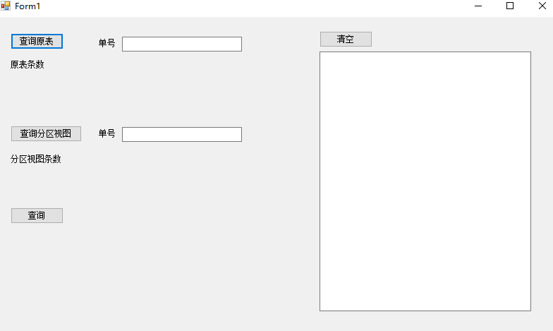 using System; using System.Collections.Generic; using System.ComponentModel; using System.Data; using System.Diagnostics; using System.Drawing; using System.Linq; using System.Text; using System.Threading.Tasks; using System.Windows.Forms; namespace WindowsFormsApp1 { public partial class Form1 : Form { public Form1() { InitializeComponent(); } private void button1_Click(object sender, EventArgs e) { using (TestEntities db=new TestEntities()) { textBox3.Text += "原表查询\r\n"; for (int i = 0; i < 10; i++) { Stopwatch sw = new Stopwatch(); sw.Start(); List<sw_KCRK_b> kcrk = db.sw_KCRK_b.Where(p => p.vou_no == textBox1.Text).ToList(); sw.Stop(); string time = sw.Elapsed + "(" + sw.Elapsed.Seconds + "秒" + sw.Elapsed.Milliseconds + "毫秒)"; textBox3.Text += time + "\r\n"; } } } private void button2_Click(object sender, EventArgs e) { using (TestEntities db = new TestEntities()) { textBox3.Text += "分区视图查询\r\n"; for (int i = 0; i < 10; i++) { Stopwatch sw = new Stopwatch(); sw.Start(); List<V_sw_KCRK_b> kcrk = db.V_sw_KCRK_b.Where(p => p.vou_no == textBox2.Text).ToList(); sw.Stop(); string time = sw.Elapsed + "(" + sw.Elapsed.Seconds + "秒" + sw.Elapsed.Milliseconds + "毫秒)"; textBox3.Text += time + "\r\n"; } } } private void button3_Click(object sender, EventArgs e) { using (TestEntities db = new TestEntities()) { var kcrk_b = db.sw_KCRK_b; label3.Text = "原表条数:" + kcrk_b.Count().ToString(); var V_kcrk_b = db.V_sw_KCRK_b; label4.Text = "分区视图条数:" + V_kcrk_b.Count().ToString(); } } private void button4_Click(object sender, EventArgs e) { textBox3.Text=""; } } }