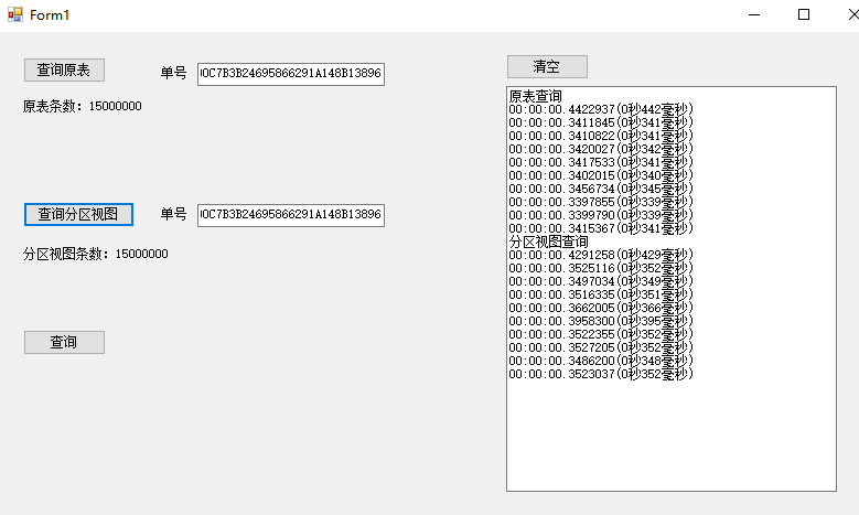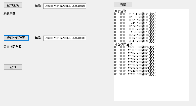 可以从代码看出,我分别对原表查询和分区视图查询都进行了10次查询