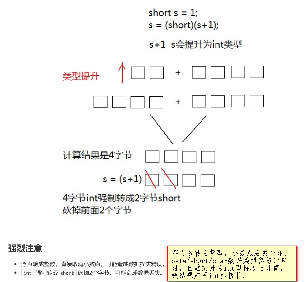 将取值范围小的数据类型自动提升为取值范围大数据类型;byte,short,char运算时直接提升为int