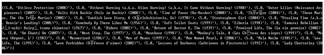 2、 根据用户打分数据构造物品相似度矩阵;根据相似度矩阵构造用户推荐列表,例如给ID为87的用户推荐的影片如下: