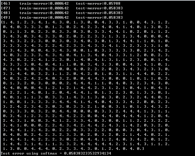 然后将特征矩阵随机划分成训练集(70%)、测试集(30%),进行训练、测试:文章共分为5类分别用0-4来表示;图4表示每篇文章所属分类;图5表示每篇文章归入某一类别的概率。