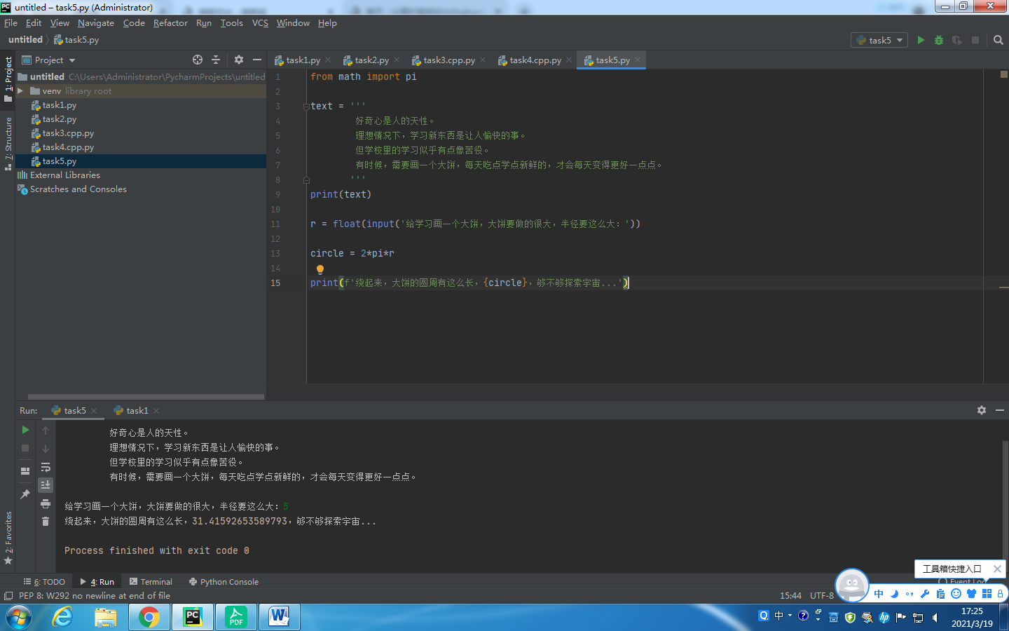 print(f'绕起来,大饼的圆周有这么长,{circle},够不够探索宇宙...')